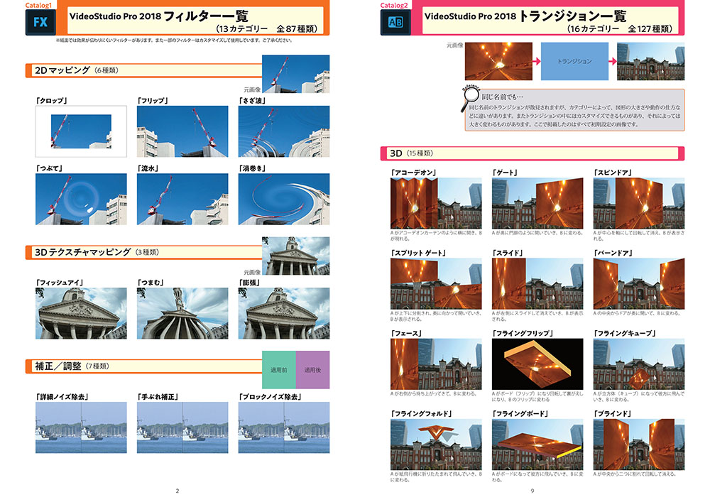 VideoStudio 2018 PRO/ULTIMATE オフィシャルガイドブック 著 者:山口正太郎 B5変型 216頁 オールカラー 定価 2,380円+税 ISBN978-4-907804-40-4 書店・ショップがお近くに無い方は、 ⇒こちらでもお求めになれます。 本書をご購入いただいた方全員に 「VideoStudio Pro 2018フィルター・トランジションカタログブック」のPDF版をプレゼントします。 ※VideoStudio 2018に機能を追加するものではありません。 見本を見てみる |